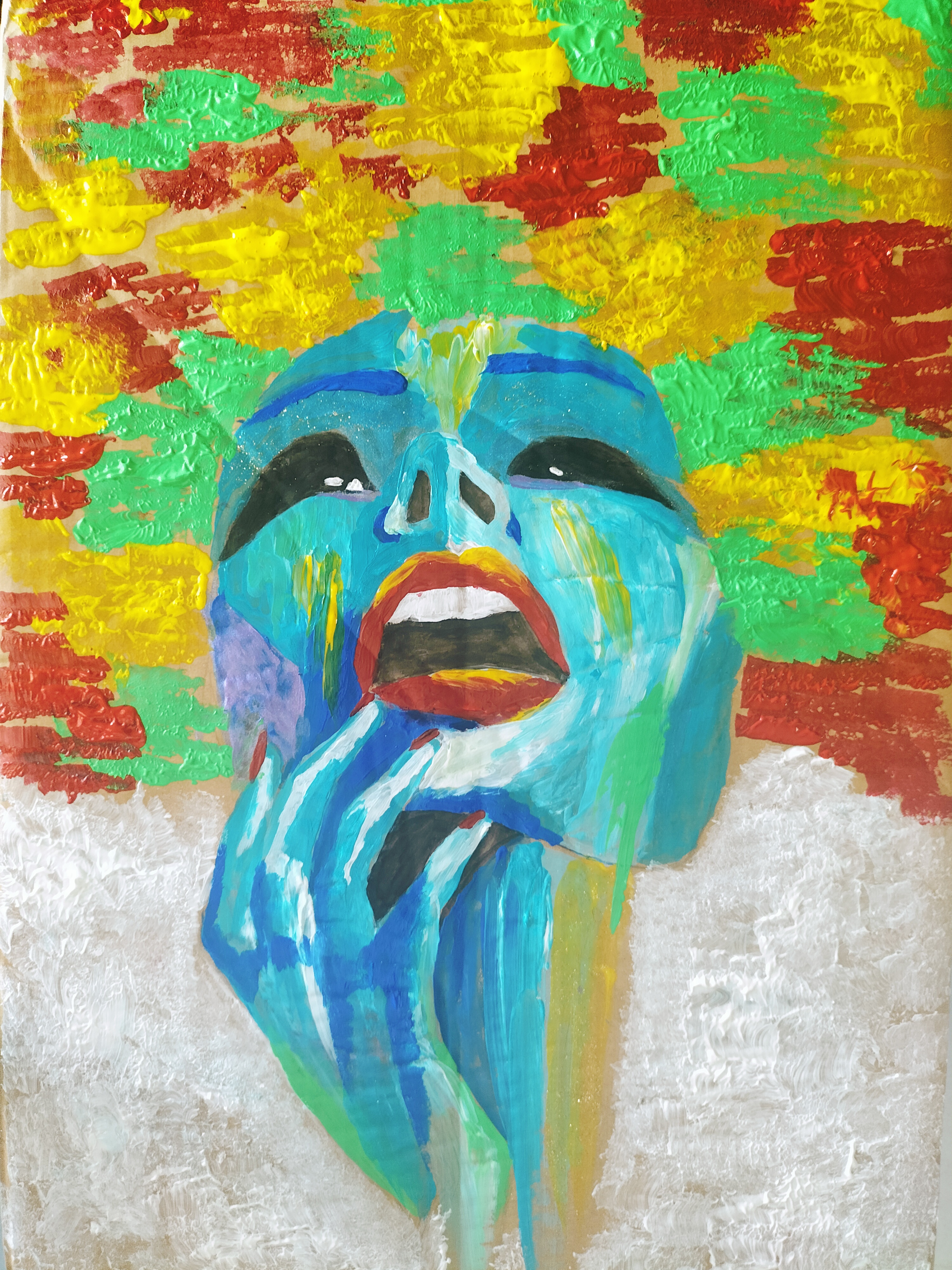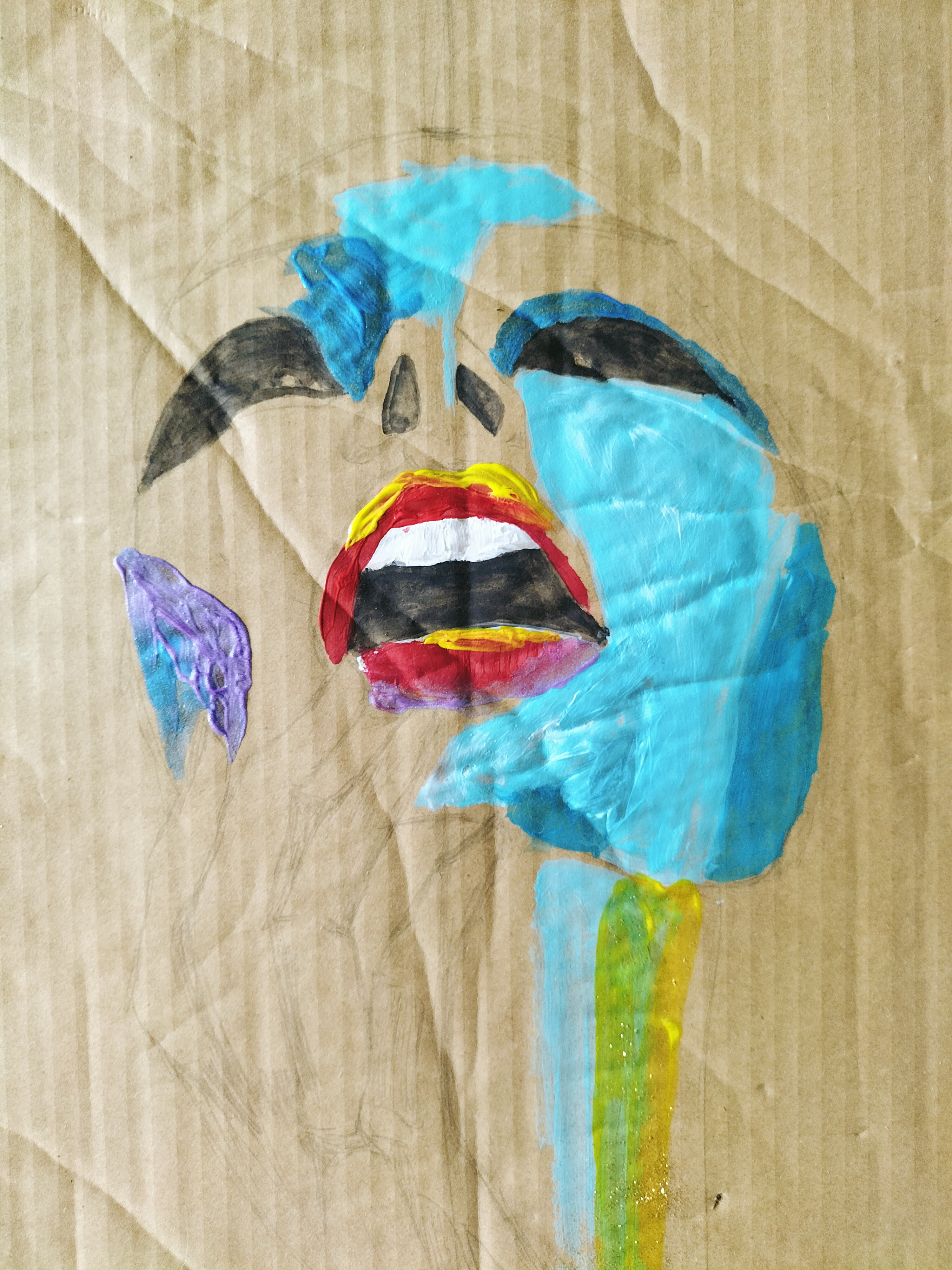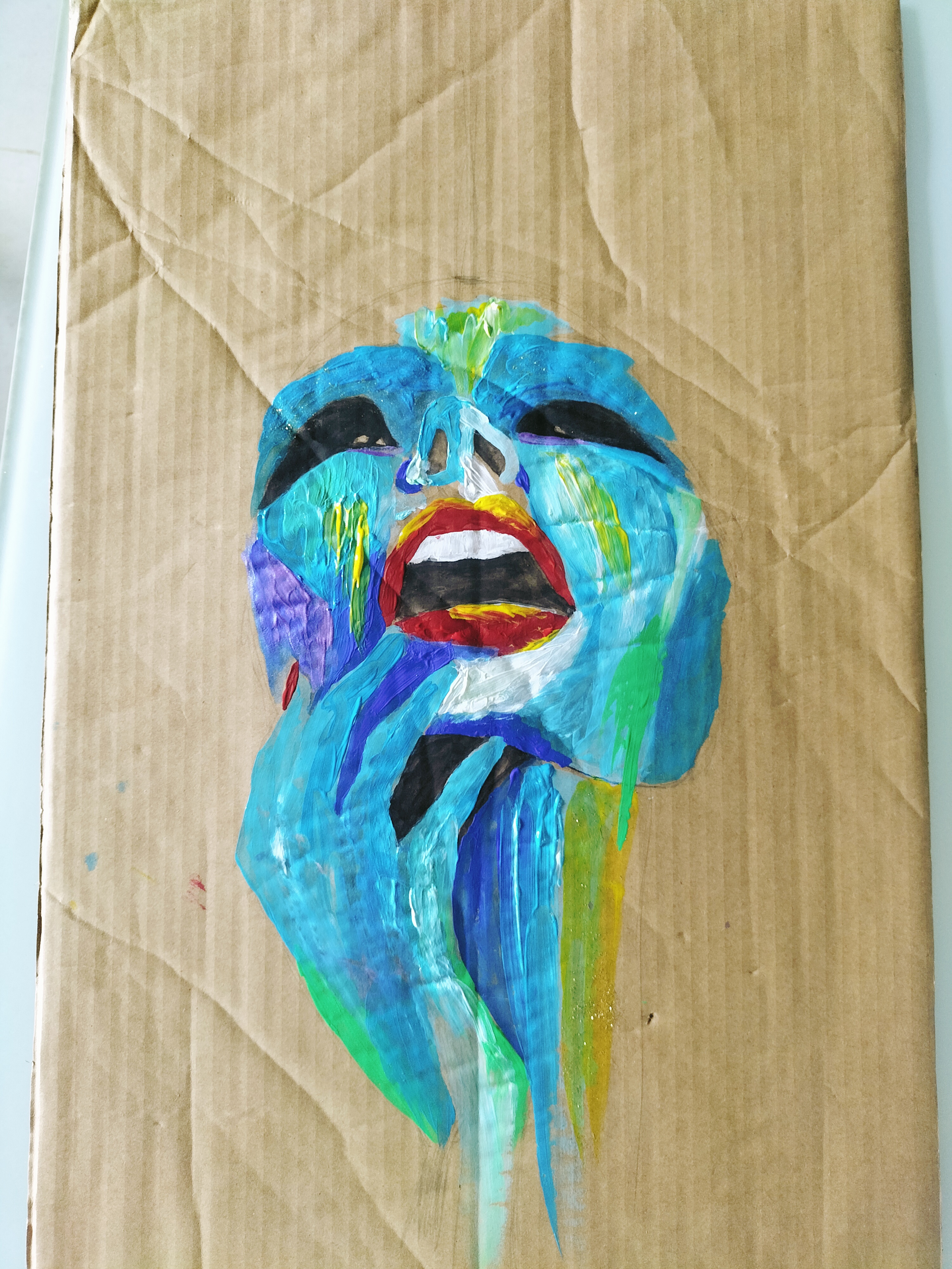 Voici ma réalisation d’aujourd’hui : sur une chute de carton, j’ai transformé un modèle de portrait au crayon en portrait surréaliste a l’acrylique.